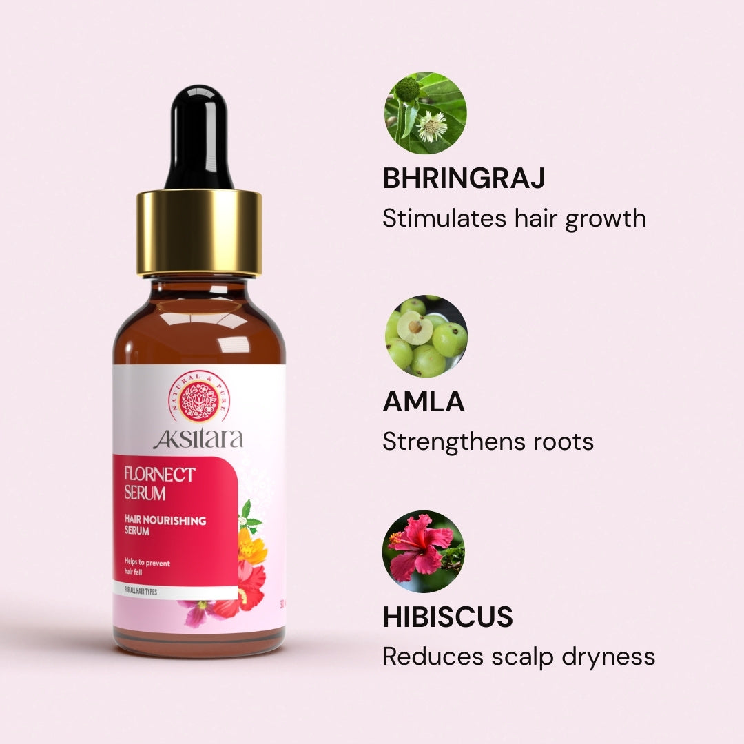 Aksitara Flornect Serum is a gentle yet powerful Ayurvedic hair serum designed to repair damaged hair, reduce dandruff, control frizz, and support healthy hair growth. Crafted with time trusted herbs like Bhringaraj, Amla, Hibiscus, and Neeli. This lightweight oil based serum deeply nourishes the scalp and strands without weighing the hair down. Suitable for all hair types and free from harsh chemicals.